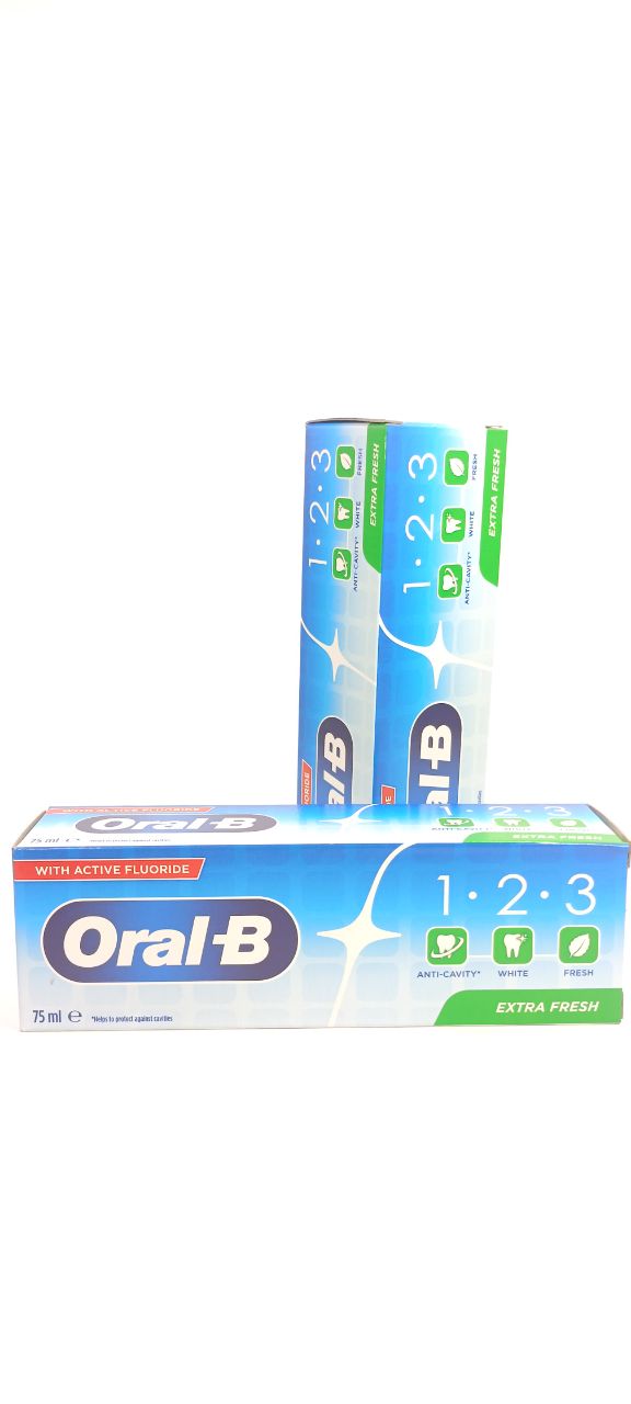 مقدار کافی از oralb-123-extra-fresh-75ml-original را روی مسواک قرار دهید و حداقل ۲ دقیقه دندانها را مسواک بزنید.